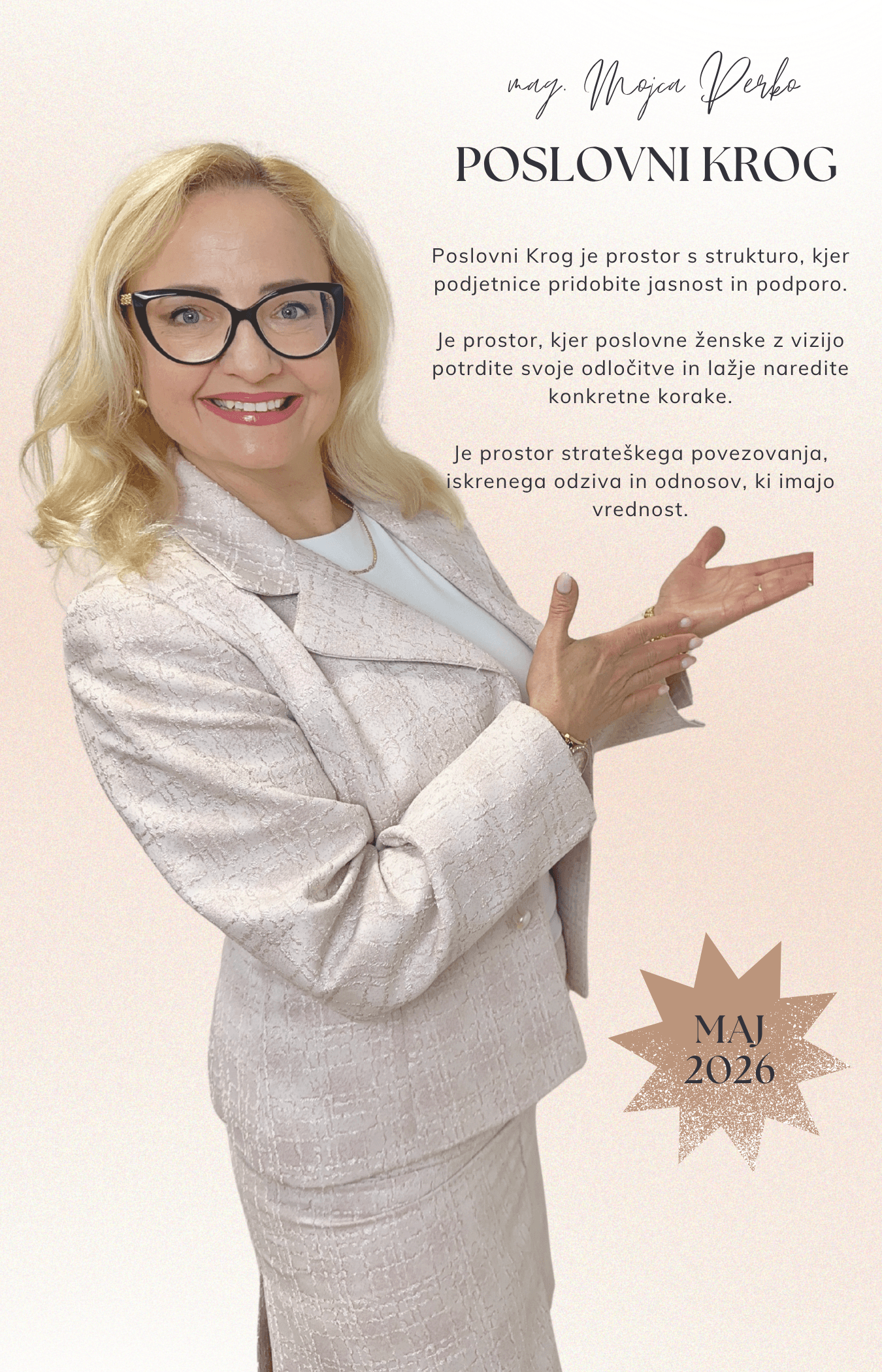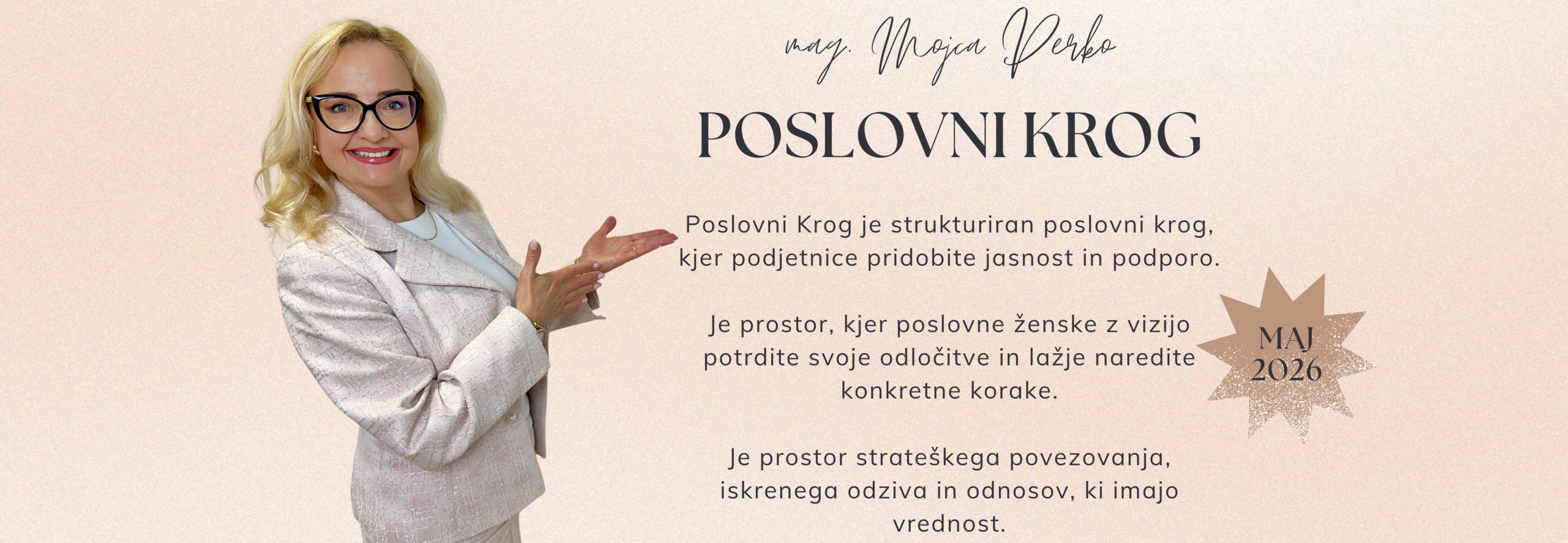 Poslovni Krog z mag. Mojco Perko je strukturiran cikel treh skupinskih srečanj podjetnic, kjer delaš na svojem konkretnem poslovnem izzivu, pri čemer ne ostajamo pri teoriji, ampak gremo v jasnost, odločitve in takojšnjo implementacijo.