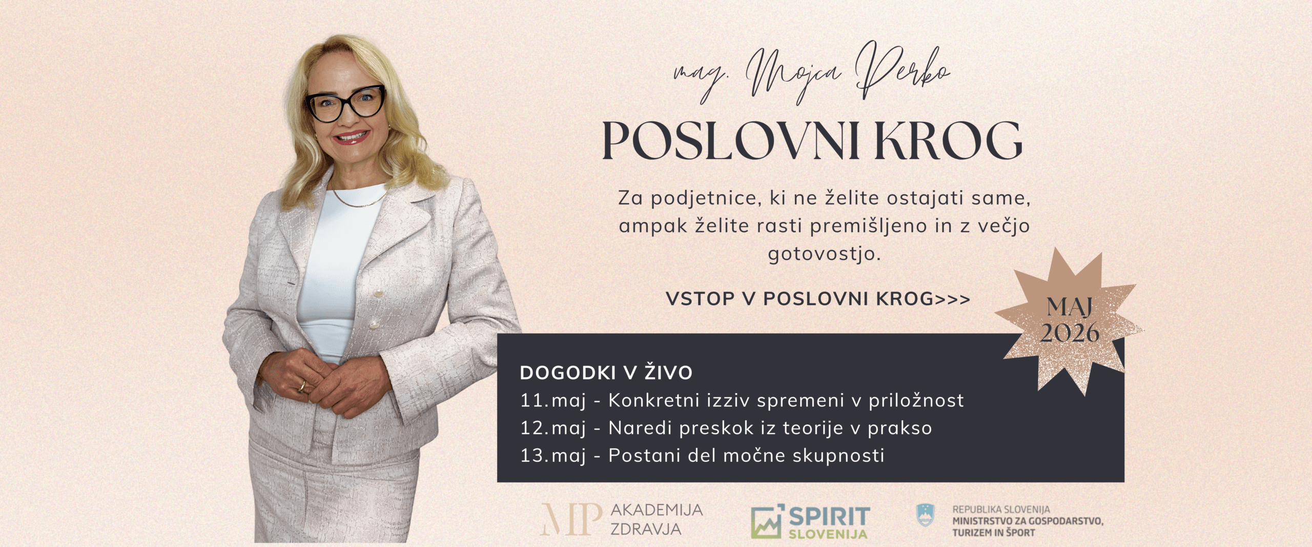 Majski poslovni krog je strukturiran razvojni proces, kjer v treh zaporednih srečanjih delaš na rasti svojega podjetja, konkretno, sistematično in z jasnim ciljem.